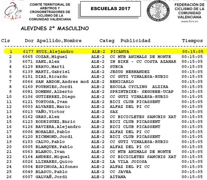 El jove cicilsita picanyer Alejandro Ruiz Garcia, membre de l'escola del Club Ciclista Picanya, aconseguí proclamar-se campió autonòmic de la Comunitat Valenciana (categoria aleví) en la Final Autonòmica d'Escoles de Ciclisme celebrada el dia 24 de juny a la població de Bétera.