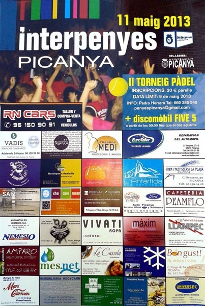 Este dissabte 11 de maig les penyes festeres de Picanya han organitzat, al Poliesportiu Municipal, tota una jornada d'activitats que arrancarà amb la disputa del II Torneig "Interpenyes" de pàdel i que finalitzarà, a partir de les 00.00h, amb la discomòbil Five5 animant a ballar a totes i tots. Així que, aquest dissabte, esport de matí i festa per la nit!