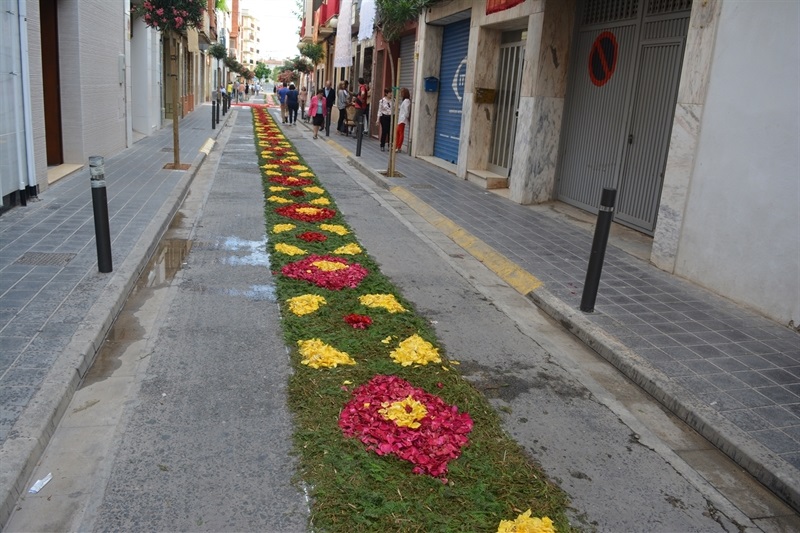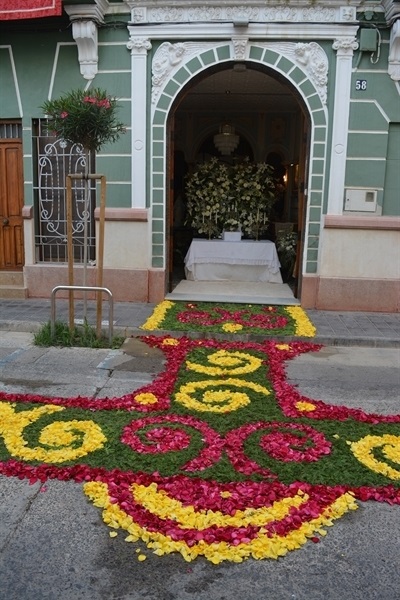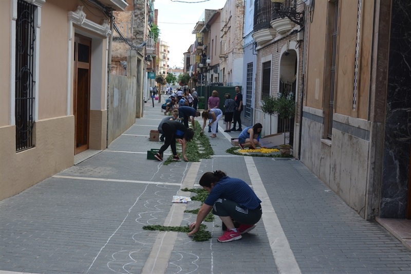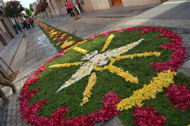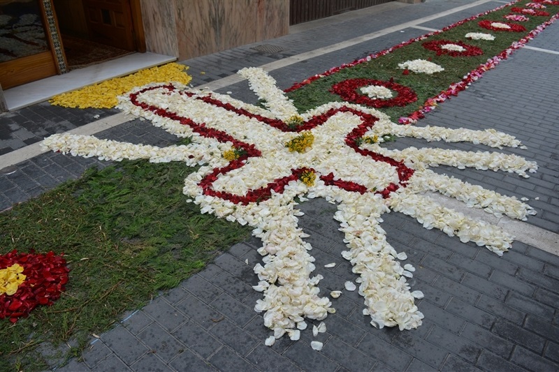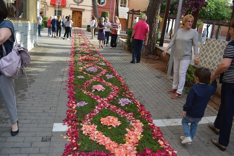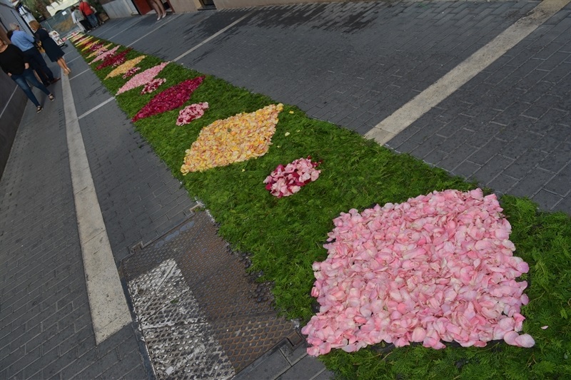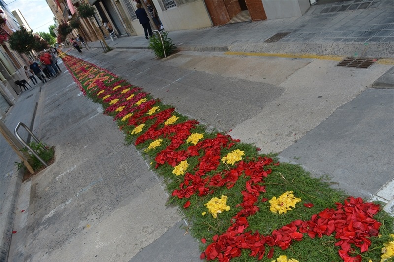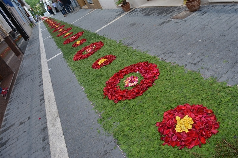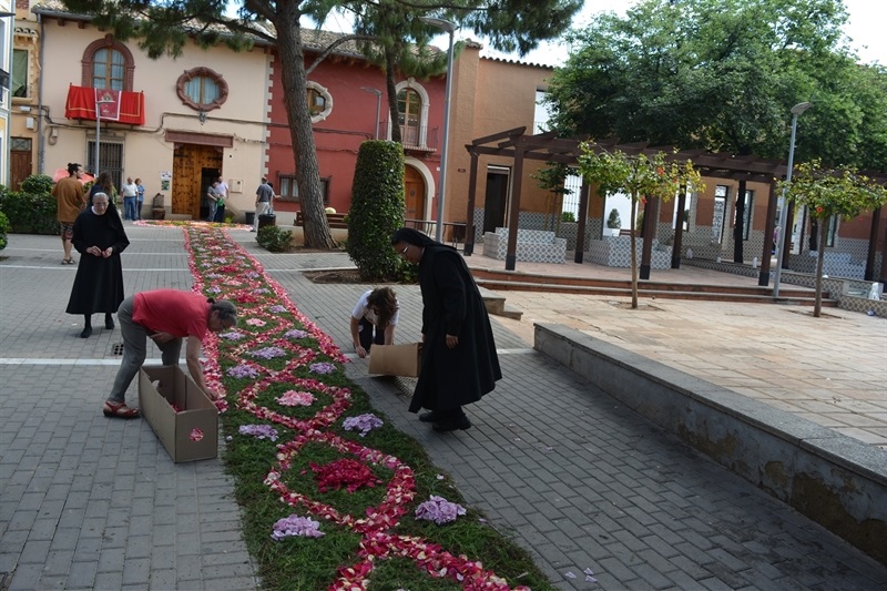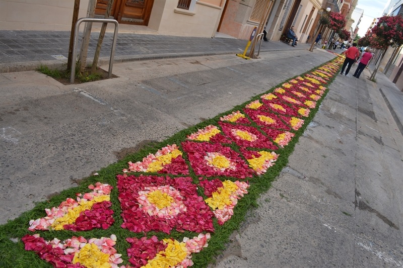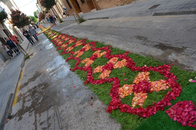Imatges de la tradiconal estora de flors confeccionada pel veïnat del centre històric amb motiu de la Processó del Corpus.