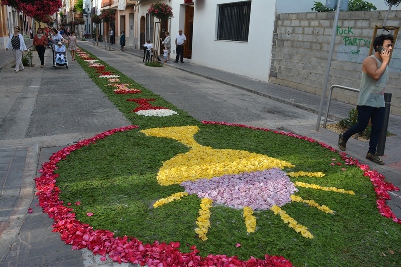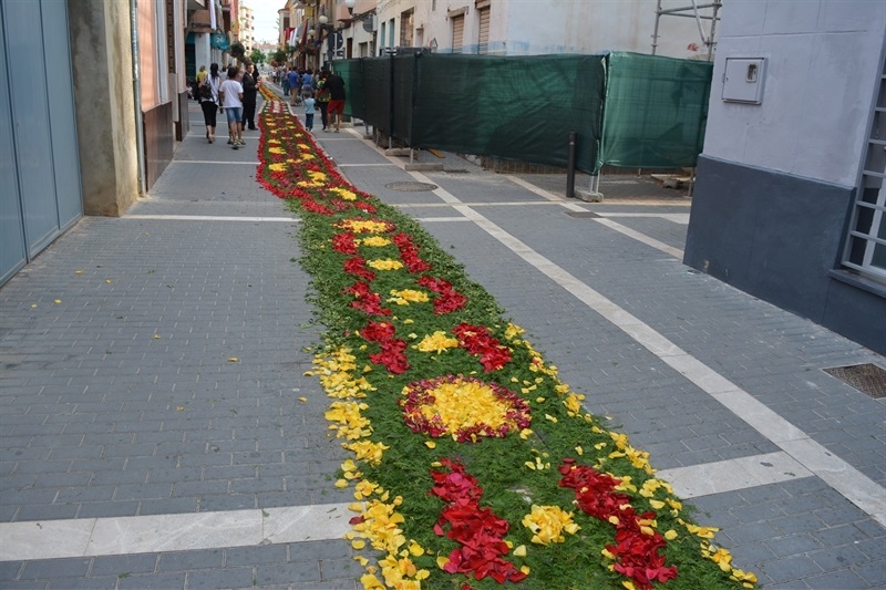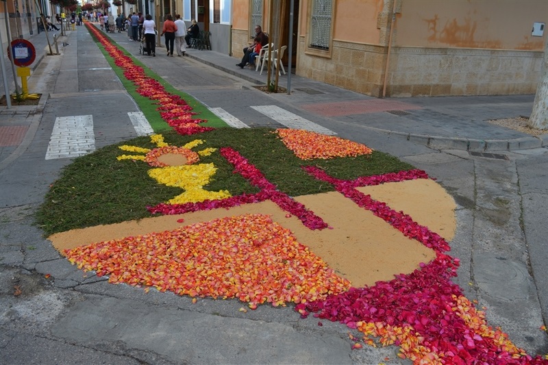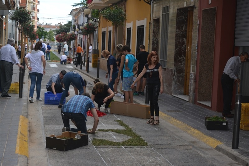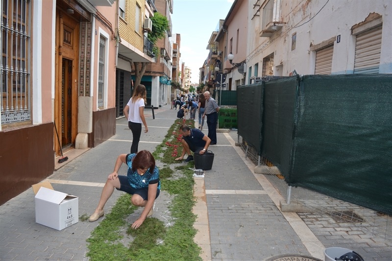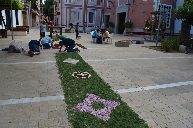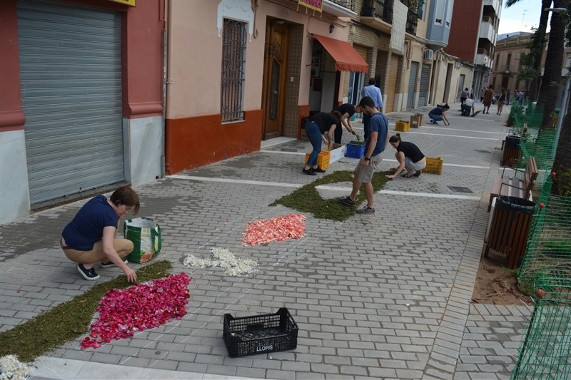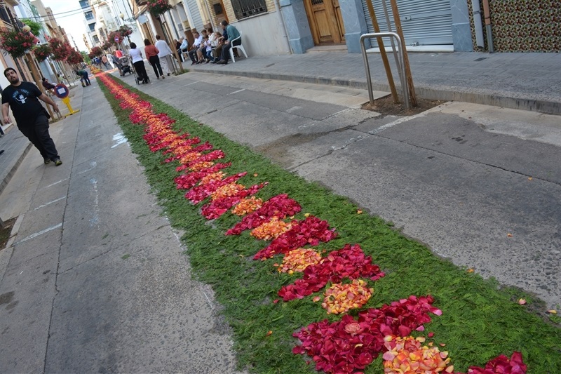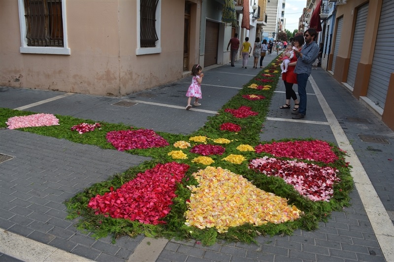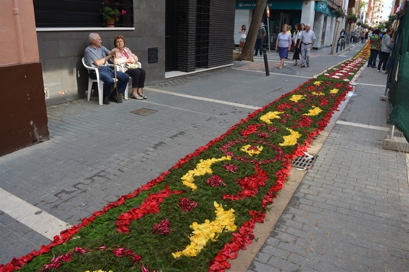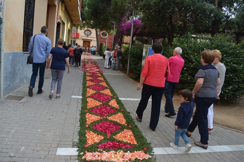 Imatges de la tradiconal estora de flors confeccionada pel veïnat del centre històric amb motiu de la Processó del Corpus.