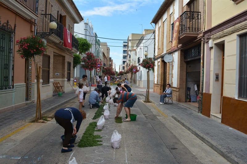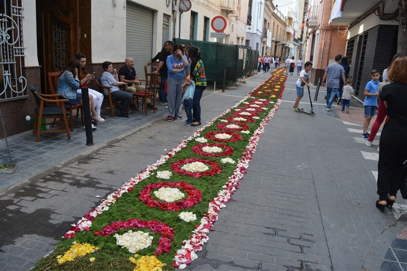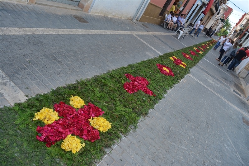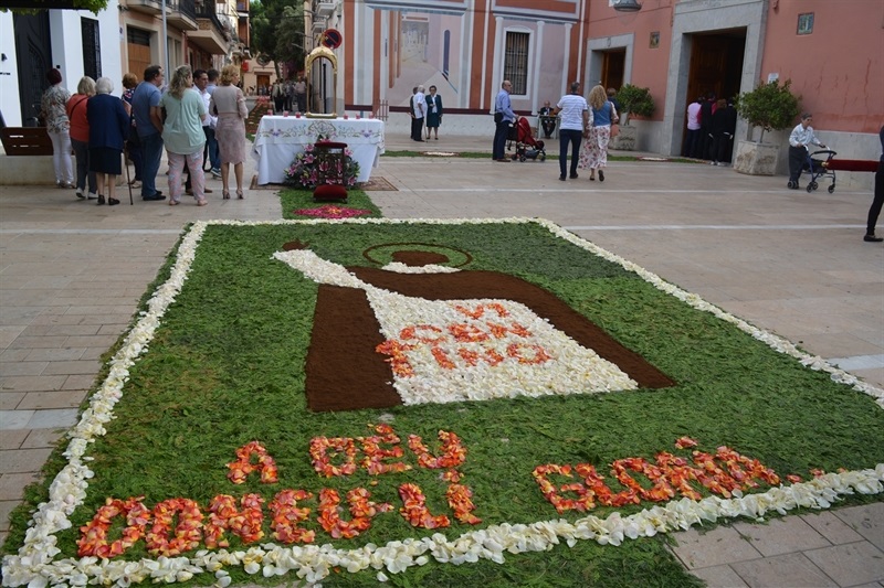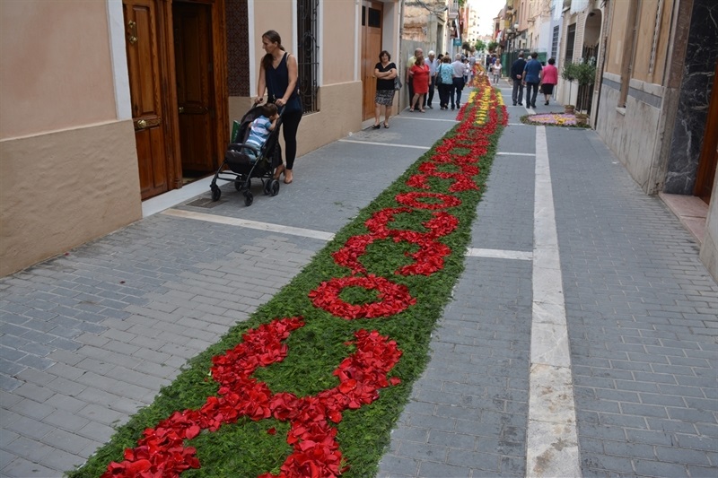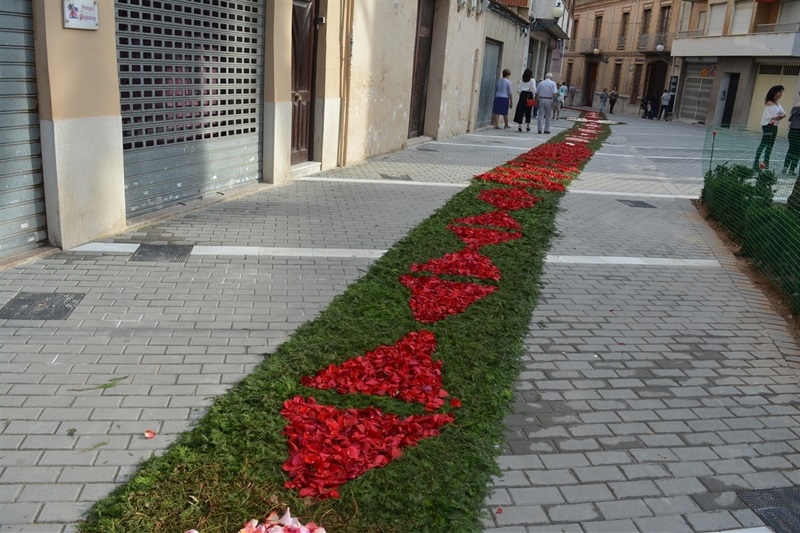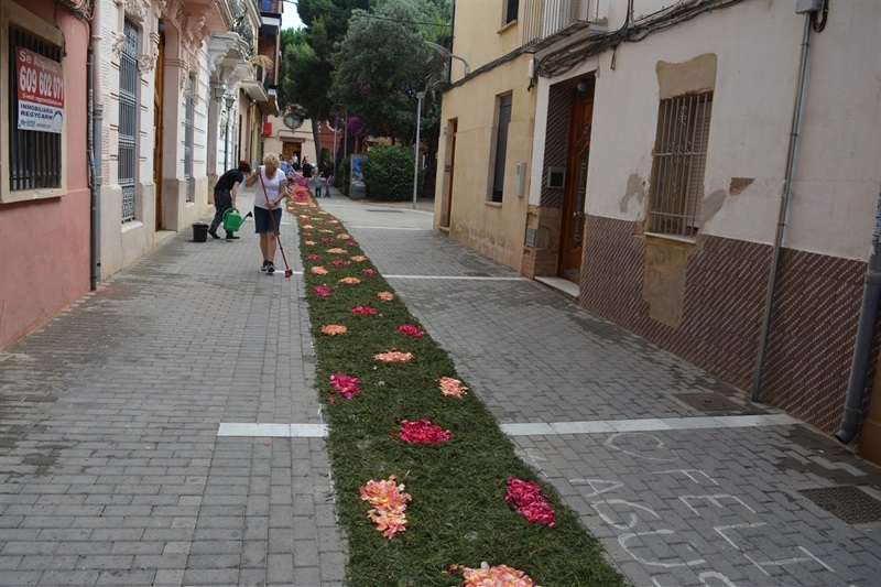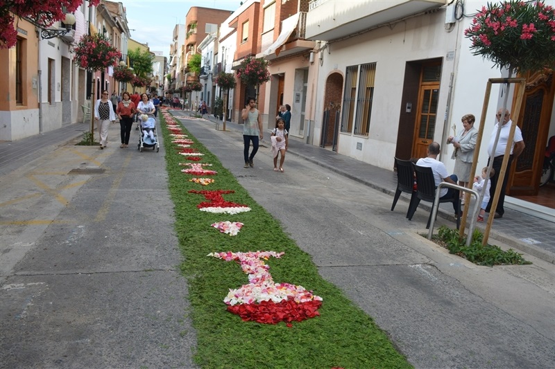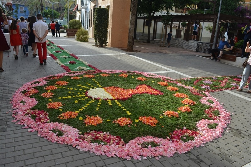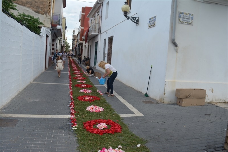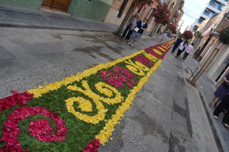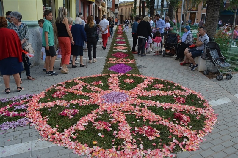 Imatges de la tradiconal estora de flors confeccionada pel veïnat del centre històric amb motiu de la Processó del Corpus.