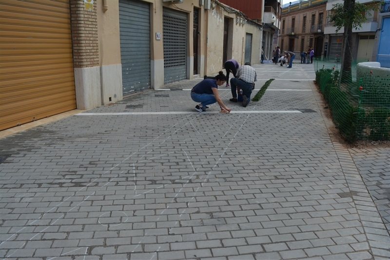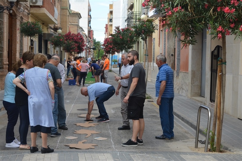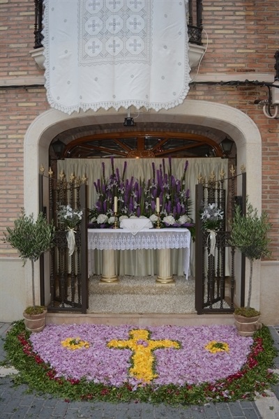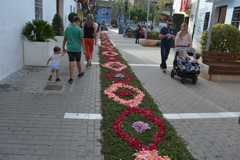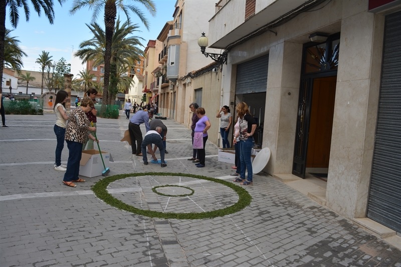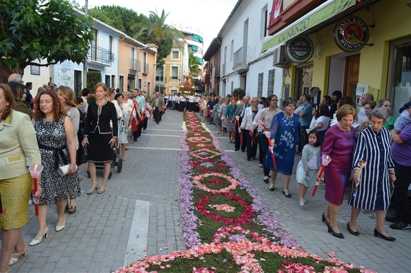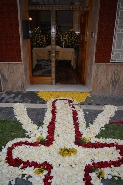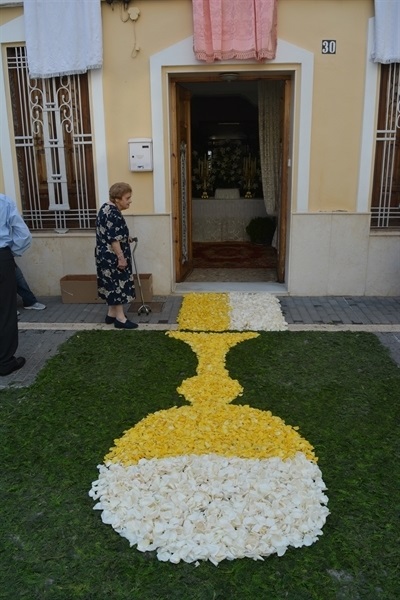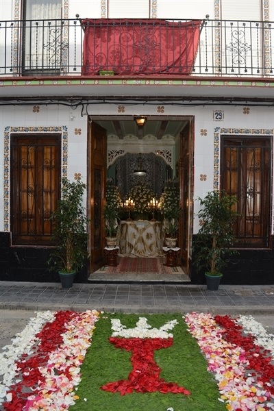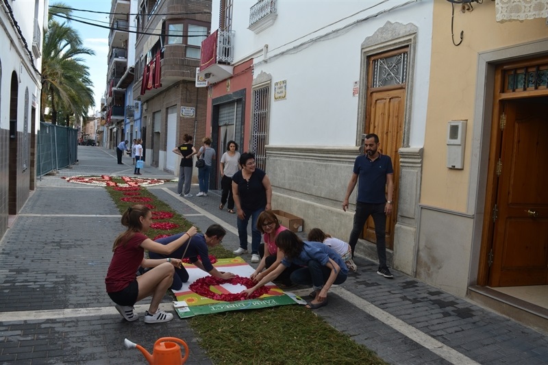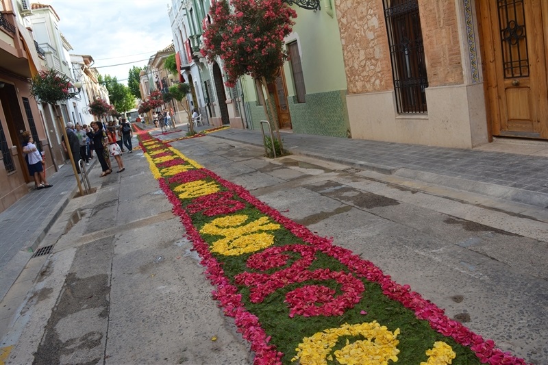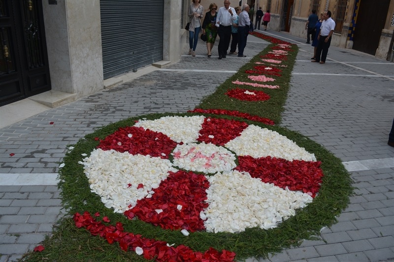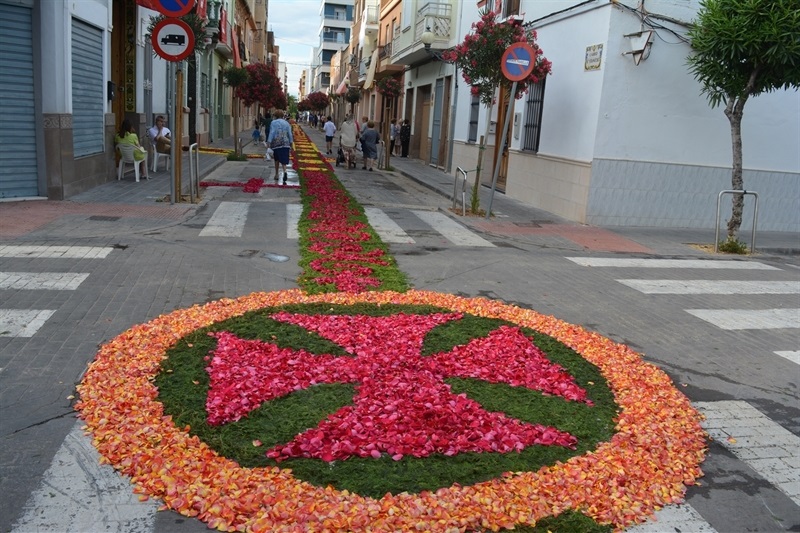 Imatges de la tradiconal estora de flors confeccionada pel veïnat del centre històric amb motiu de la Processó del Corpus.
